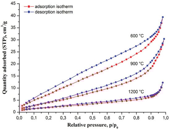 Nitrogen adsorption–desorption isotherms of electrospun ZrAA/Y(NO3)3/PAN fibers calcined at 600, 900 and 1200 °C.