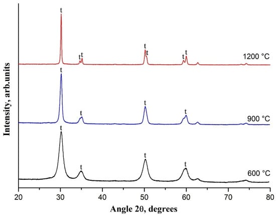 X-ray diffraction (XRD) patterns of electrospun ZrAA/Y(NO3)3/PAN fibers calcined at 600 °C, 900 °C and 1200 °C; t—tetragonal phase of ZrO2.