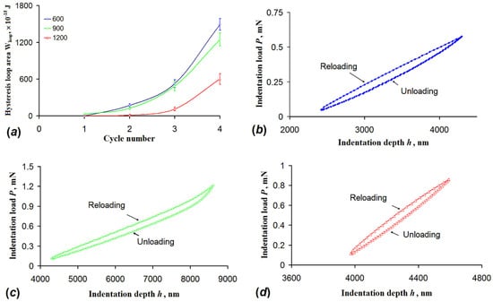 (a) The dependence of the energy stored in the hysteresis loop on the number of reloading cycles. The types of hysteresis loops after the third cycle of unloading–reloading for different calcination temperatures: (b) 600 °C; (c) 900 °C; (d) 1200 °C.
