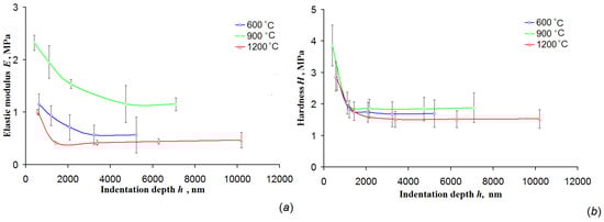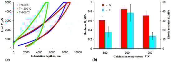 According to the P–h diagram the smallest indentation depth of about 5.5 μm at a maximum load of 5 mN occurred if the mat calcined at 900 °C was tested (Figure 7a). It indicates that hardness of this mat was higher than one of the mats calcined at 600 and 1200 °C. Performed P–h diagram analysis showed that the mat calcined at 900 °C possessed the highest elastic modulus too (Figure 7b). These results were similar to those obtained when the 10 µm indenter was used (Figure 6).