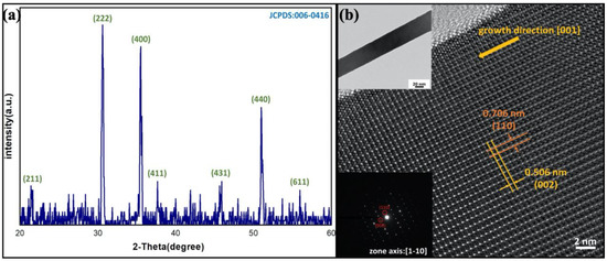 The development of nanotechnology has dramatically changed the world with electronic devices being hugely upgraded over the last decades. Different studies on various nanowires are flourishing in order to fulfill the need of the technology [1,2,3,4]. Among them, indium oxide has gained lots of attention. Indium oxide is a transparent semiconducting oxide (TSO) with a large band gap; however, the exact value of the band gap is still under debate [5]. Undoped indium oxide has an n-type semiconductor behavior due to the oxygen vacancies that naturally exist in indium oxide. These unique properties make indium oxide an appealing material to be applied in various fields, such as transparent conducting oxide (TCO), indium tin oxide (ITO), field effect transistors [6], light-emitting devices [7], and ultraviolet sensors [8].
