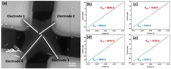 (a) SEM image of the nanowire under electrical measurements. The nanowire was connected to four independent electrodes by Pt connection. (b–e) Resistance measurements between different electrodes.