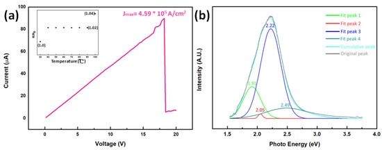 (a) Measurement of breakdown current density with the inset showing the temperature-dependent resistivity change. (b) Room temperature PL spectrum of the indium oxide nanowires, where the strongest value occurred at 2.22 eV.