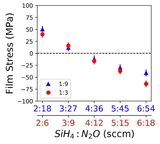 Residual SiO2 film stress varies with flowrate of SiH4 and N2O. A positive value in film stress indicates a tensile film and a negative value indicates a compressive film. For the 1:9 SiH4 to N2O ratio (triangle) and 1:3 SiH4 to N2O ratio (circle), the maximum standard deviation of the measurement is 6.4 MPa.