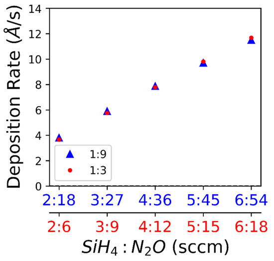 Fine-tuning the intrinsic stress during film deposition without affecting the refractive index appears feasible. The low refractive index (n) values compared to bulk SiO2 (n = 1.5) indicate that the porosity or stoichiometry may be different from bulk SiO2. The deposition rate varies with flowrate, as shown in Figure 3.