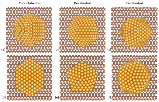 We focus on 561-atom nanoclusters that lie in the catalytically active regime. Such clusters are routinely produced by cluster deposition methods such as the gas-phase condensation method. Choosing a “magic number” for the nanoclusters also allows for a ready comparison between the three highly ordered structural motifs, the cuboctahedral, the Ino-decahedral, and the icosahedral, which are shown to be dominant for Au NPs of this size [23]. We place these NPs on a 576-atom graphene sheet for two distinct cases: (i) where the Au NPs sit with their (111) facets on graphene and (ii) where the NPs are oriented with their vertex on graphene (Figure 1). In both cases, we compare the bonding with and without a graphene vacancy under the NP. We also check for the energetically preferable position of the vacancy under the (111) cluster facet.
