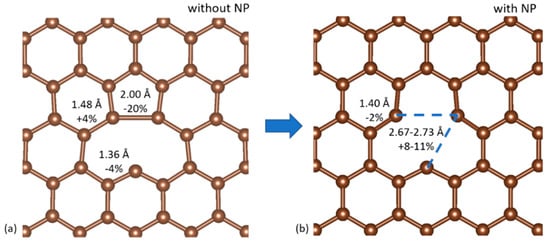 (a) The Jahn–Teller distortion of graphene vacancies and (b) its removal caused by the presence of the NP vertex. The bond lengths and their relative change compared to pristine graphene are noted.