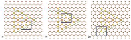 Cross-sections of the top-down projection for the three different positionings of the vacancy under the triangular (111) facet of the NPs: (a) under one edge of the triangle, (b) near the center of the triangle and (c) under a vertex of the triangle (relaxed models).