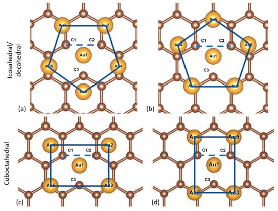 The corresponding binding energy results after relaxation are shown in Table 2. For the decahedral and icosahedral NPs, the orientation of Figure 6b is slightly preferred energetically, possibly because three Au atoms (Au2, Au3, and Au6) sit directly on top of C atoms. However, the energy difference is minimal, only 0.001–0.002 meV. For the cuboctahedral NP, we observe an energy difference of 0.06 eV between the two orientations, with the orientation shown in Figure 6c being the lower energy one. The binding energies of the NPs with a vertex on pristine graphene and on a graphene vacancy are compared in Table 2. For all three structural motifs, the presence of the vacancy strengthens the bonding of the NPs on graphene by several eVs. Moreover, although few Au atoms interact with the C atoms-mainly the 1 atom at the NP tip and, secondly, the 4/5 atoms of the layer after it, the binding energies are comparable to the (111) facet-on-graphene cases.