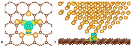 Where , and , are the electron charge densities obtained from static runs of the relaxed models of the NP on graphene, the graphene sheet and the free NP, respectively. We observed a small charge transfer to the two C atoms bonded in the Jahn-Teller distortion of 0.14 and from the third lone C atom of 0.04 . There is also a charge transfer to the Au atom at the tip of the NP of 0.23–0.24 . Visible in Figure 7a, is the uniform charge distribution between the three C atoms interacting with the NP tip. The charge density difference in Figure 7b illustrates the striking fact that only one Au atom essentially participates in the bond between the NP and the graphene sheet. This also explains the lack of any strain or deformations on the whole NP in the vertex-on-graphene cases.