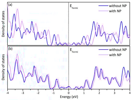 The electronic properties of graphene are affected by the presence of the NPs. In Figure 8, the partial density of states (DOS) of graphene sheets sampled at the Γ-point with and without Au NPs is shown. The greater effect is observed in the facet-down case. In Figure 8a a comparison between pristine graphene and pristine graphene interfaced with the (111) facet of an icosahedral Au NP is shown. All peaks are “shifted” towards higher energies by ~0.2 eV when the NP is added. When an icosahedral NP is placed with a vertex on a graphene vacancy, the levels before and after the peak of the Fermi level are again “shifted” towards higher energies by ~0.1 eV (Figure 8b).