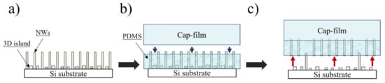 During the encapsulation process PDMS base was mixed with a curing agent (10:1 mass ratio) and dropped onto the samples of 2 cm2 size and G-coated at 5000 rpm for 40 min. After PDMS deposition, the samples were cross-linked in a muffle oven at 80 °C for 8 h. The PDMS/NW membrane was released from the silicon substrate with the use of a thick PDMS support layer (50–150 µm), denoted as cap-film. This layer was necessary for the mechanical stability of the thin NW-encapsulated membrane (see Figure 1b). Then, as shown in Figure 1c, the polymer membrane was released from the Si substrate. The NW encapsulation and exfoliation technique employing cap-film for mechanical support was described by Neplokh et.al. in [,].