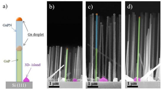 First, let us discuss the effect of the nitrogen flux on the self-catalyzed VLS NW growth mechanism. Side-view cleaved edge SEM images of the synthesized samples are presented in Figure 2b–d. Both vertically-oriented NWs and unwanted 3D parasitic islands are formed in all samples and are depicted in Figure 2 as green rods and magenta polygons, respectively. Both NWs and parasitic islands have similarly oriented in-plane hexagonal cross-sections. It should be noted that despite the introduction of the active nitrogen flux, the height of heterostructured GaPN/GaP NWs increases proportionally to the growth time. As can be judged from the statistical analysis of the NW arrays morphology, both mean heights and diameters of the pure GaP and heterostructured GaPN/GaP NWs are identical. The average length of the studied GaP NWs stem-sample is 3.3 µm, of the reference GaP sample—about 6.6 µm and heterostructured GaPN/GaP NWs is 6.2 µm.
