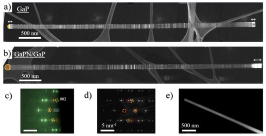 Comparison of high-angle annular dark-field imaging (HAADF) (Figure 3e) and DF-TEM images (Figure 3a,b) of the heterostructured GaPN/GaP and pure GaP NWs shows no evidence of any visible contrast, which can indicate the possible formation of a GaPN/GaP heterointerface. Comparing the reference sample with heterostructured GaPN/GaP NWs and GaP stems, no significant difference in the crystal structure and crystal perfection can be distinguished. Apparently, a small change in the GaPN lattice constant with small concentration of nitrogen (<1%) is insufficient for its detection by electron microdiffraction or EELS. This may indicate that the incorporation of a small amount of the nitrogen atoms into the GaP matrix has practically no effect on the crystal structure and perfection of the synthesized NWs. In addition, we were not able to detect any prominent signal from nitrogen species by both EELS and EDS techniques in STEM analysis.