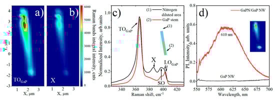 Spatial distribution maps of the integrated Raman scattering intensity of the TO and X-mode from individual NW are shown in Figure 4a,b, correspondingly. Heterogeneous distributions of TO- and X-Raman bands intensity along the NW are clearly visible. One can note that TO-mode intensity is increased in a NW upper segment. We suggest that the overall increase of TO-mode intensity together with an appearance of diluted nitride specific X-mode can be associated with an increase in absorption cross-section in direct-bandgap GaPN material. Thus, we suggest that the absence of the X-alloy Raman band at spectrum 2 is the evidence of the absence of the incorporated N atoms into the GaP stem of heterostructured NW.