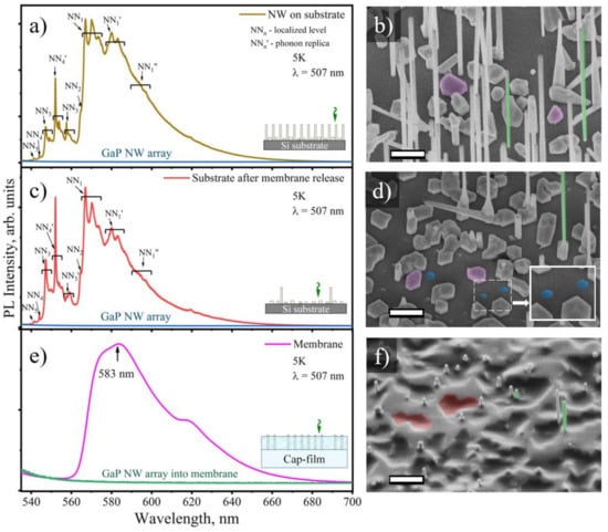 PL spectra, acquired at the Si substrate with as-grown NWs and the substrate after membrane exfoliation demonstrate the presence of two broad peaks with fine structure (see Figure 5a,c). A set of sharp peaks can be attributed to highly-localized N-levels (and their phonon replica) in parasitic islands, where NNi is the position of highly-localized N levels in diluted nitrogen GaPN solid alloys (see Figure 5a,c). The nature of these peaks is associated with the recombination of carriers through localized states formed by the closest pairs of nitrogen atoms. The detailed description of these states was reported on by Thomas [] and Lazarenko []. The presence of peaks on PL spectra is the evidence of a quasi-direct bandgap of GaPN solid alloys []. Relatively high intensities of NN3 and NN4 peaks indicate the low average content of N atoms diluted into GaPN parasitic islands and also show the quasi-direct bandgap of alloy. The concentration of nitrogen impurities can be estimated as 0.2–0.3% [,,,,].