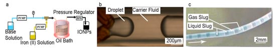 Drop-wise flow reactors further promote the small reaction volumes by dividing the main solution into droplets, so that the reaction homogeneity is further improved. This technique is schematically illustrated in Figure 1c. Drop-wise flow reactors generally have three inlets, two for the primary mixing solutions and one for a carrier fluid. The two inlets for the primary mixing solutions are angled into the main channel such that they are able to form droplets within the carrier fluid. As the carrier fluid is continually pumped through the channels, droplets are continuously formed and transported along the channel. Within a droplet, the advective convection drives the creation of IONPs. Both tubular and chip reactors have been developed to make IONPs by this drop-wise technique.