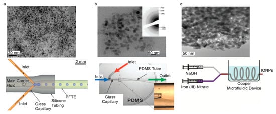 TEM images of IONPs and the respective schematics of microfluidic devices mainly made from (a) PFTE (Reproduced with permission from [68]. Copyright Royal Society of Chemistry, 2012), (b) glass (Reproduced with permission from [69]. Copyright Royal Society of Chemistry, 2008) and (c) copper (Reproduced with permission from [70]. Copyright Walter de Gruyter, 2011).