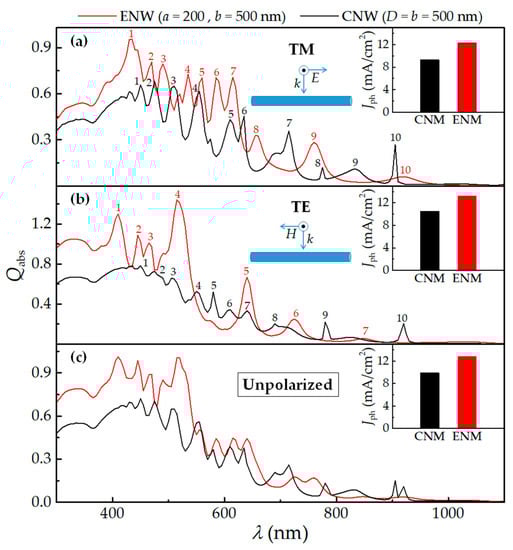 To quantitatively characterize the light-trapping performance of the ENW in comparison with the CNW, we first examine the absorption spectra obtained by Equation (3). In Figure 2, we show λ-dependent Qabs spectra of the ENW with a = 200 and b = 500 nm and the CNW with D = b = 500 nm under normally-incident transverse-magnetic (TM), transverse-electric (TE) and unpolarized light, respectively. It is important to emphasize that the unpolarized illumination, like sunlight, is calculated by averaging TM and TE light illumination. TM and TE lights are shown in the inset in the top center of Figure 2a and Figure 2b, respectively. It is clear that Qabs of the ENW is much bigger than that of the CNW in the short-wavelength range of λ < λcTM ~ 675, λ < λcTE ~ 545 or λ < λc ~ 670 nm for TM, TE or unpolarized light (except for several narrow peaks, for example, λ = 555 nm for unpolarized light), which can result in a significant photocurrent enhancement since the Qabs spectra of the CNW well matches the solar spectrum according to Equation (8). In comparison, the light absorption of the ENW seems to be comparable in the long-wavelength range of λ > λcTM, λ > λcTE or λ > λc, which can lead to a little contribution to the photocurrent enhancement. Note that λcTM, λcTE and λc are the characteristic wavelengths, below which the light absorption is always enhanced and can be readily determined for a fixed a, b and D.