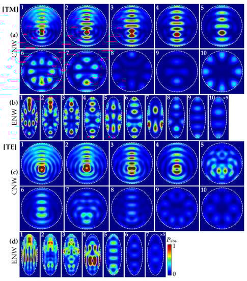 The representative normalized absorption mode profiles (Pabs) for the CNW and ENW at the absorption peaks indicated by Arabic numerals in Figure 2a,b and Figure 3: (a,b) for TM and (c,d) for TE light illumination (with an identical color scale); (a,c) for the CNW with D = b = 500 nm and (b,d) for the ENW with a = 200 and b = 500 nm, respectively. Note that Pabs in b(10) and d(7) are properly magnified for better illustration.