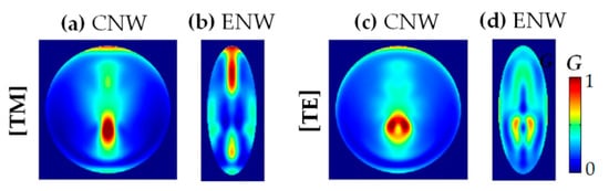 To further confirm the physical mechanism discussed above, we show the photogeneration rate (G) calculated by Equation (6). In Figure 5, we present the normalized G profiles of the CNW (D = b = 500 nm) and the ENW (a = 200 and b = 500 nm) for TM and TE light illumination. Note that Figure 5a,c show the normalized G profiles of the CNW for TM and TE light, while Figure 5b,d show those of the ENW, respectively. It is observed in Figure 5a,b that the absorption of the ENW is much stronger at both ends of the horizontal axis than that of the CNW for TM light. At the same time, it is observed in Figure 4c,d that the absorption of the ENW fills in the whole NW for TE light, consistent with the results discussed above. These results further demonstrate that this enhancement arises mainly from the excitation of more LMR modes caused by decreasing a compared to the CNW with D = b. In other words, the ENW can better interact with the incident light compared to the CNW, leading to more resonant absorption sites appearing and filling in the whole ENW.