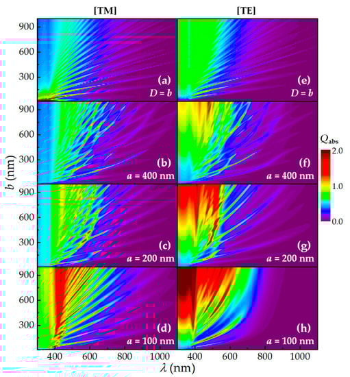 Qabs versus b and λ for the CNWs and ENWs: (a–d) for TM and (e–h) for TE light illumination (with an identical color scale); (a,e) for the CNW with D = b; (b,f,c,g,d,h) for the ENWs with a = 400, 200 and 100 nm, respectively.