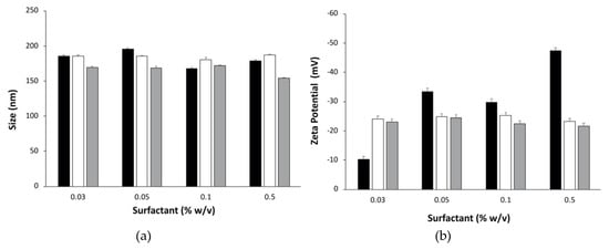 (a) Particle size and (b) zeta potential of PHB70 nanoparticles produced by emulsion/solvent evaporation method with 1.0% w/v PVA (Mw 10,000 Da) combined with different concentrations of tensioactives: lecithin (black bars), Pluronic F-68 (white bars) and TPGS (grey bars). Each value represents the mean and standard deviation of three independent replicates (n = 3).