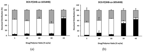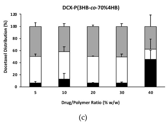 Docetaxel distribution, expressed as percentage of drug precipitated or in agglomerates (black bars), in solution (white bars) and encapsulated in nanoparticles (grey bars) in relation to the total drug recovered, determined for (a) DCX-PHB16, (b) DCX-PHB30 and (c) DCX-PHB70 nanoparticles.