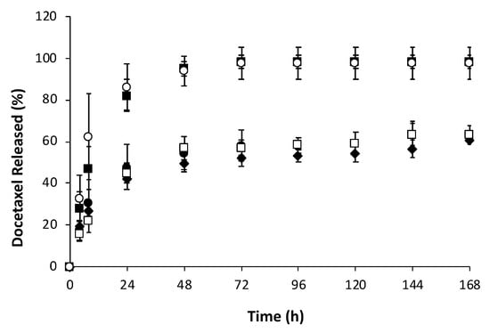 From the release profiles, two different behaviors exhibited by docetaxel-loaded PHB70 nanoparticles can be observed. P(3HB-co-4HB) nanoparticles with high drug/polymer ratio led to a relatively rapid release, while nanoparticles with drug/polymer ratio equal to or lower than 20% showed more controlled drug-release kinetics. In particular, nanoparticles with a drug/polymer ratio of 30 and 40% released more than 80% of docetaxel after 24 h and after 48 h the release was almost complete. In the case of lower drug/polymer ratios a biphasic release could be evidenced with an initial “burst” release of ~20–30% of docetaxel in the initial 8 h, followed by slower release rates with around 60% of drug released after 7 days.
