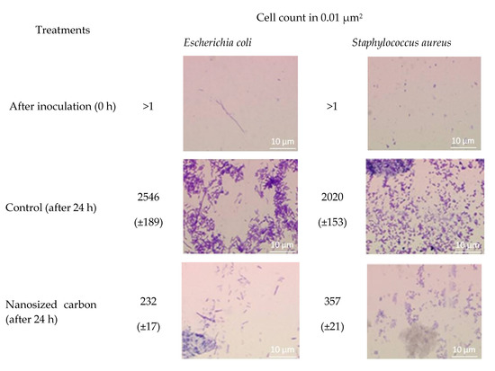 Effect of nanosized carbon coating on the development of Escherichia coli and Staphylococcus aureus. Incubation time is 24 h. For nanosized carbon, the most abundant micrographs are presented. Data are presented as mean values and standard errors.