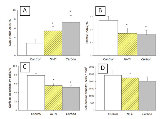 Effect of nanosized carbon coating on the main characteristics of cell culture growth and development: (A) Effect of nanosized carbon coating on cell viability; (B) Effect of nanosized carbon coating on the mitotic index of the cell population; (C) Effect of nanosized carbon coating on the rate of available area colonization; (D) Effect of nanosized carbon coating on cell culture density. Control—glass slide. Ni-Ti—nitinol medical alloy for the implant manufacture. Carbon—samples with nanosized carbon coating. *—statistically significant differences from the control (p < 0.05).