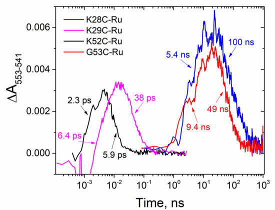 Contrary to our expectations of ultrafast charge transfer for all attachment sites within the heme binding domains, we observed ultrafast apparent charge separation only in previously reported K29C-Ru (6.4 ± 0.4 ps) and the new construct K52C-Ru (2.3 ± 0.2 ps) (Figure 3). The latter is the fastest apparent photo-induced charge separated time constant for hybrid protein-photosensitizer complexes reported to date and reaches the values observed in natural photosynthesis. In sharp contrast, the photosensitizer attachment to K28C-Ru and G53C-Ru yielded ET kinetics of about three orders of magnitude slower, with the time constants of 5.4 ± 0.5 ns and 9.4 ± 0.8 ns, respectively (Table S4). We observed a variation of apparent ratios of charge transfer time constants: 2.6-fold for K52C-Ru, 5.2-fold for G53C-Ru, 5.9-fold for K29C-Ru, and 18.5-fold for K28C-Ru. Since all three heme redox potentials are similar, we expected the ratios of charge separation to charge recombination rates to be fairly close to each other for all four constructs. A notably slower relative charge recombination in K28C-Ru may indicate stabilization of the charge-separated state through electron transfer from the proximal to Ru(II)(bpy)3 heme to one of the distal cytochrome hemes similar to the effect reported by van Wonderen and co-workers [60].