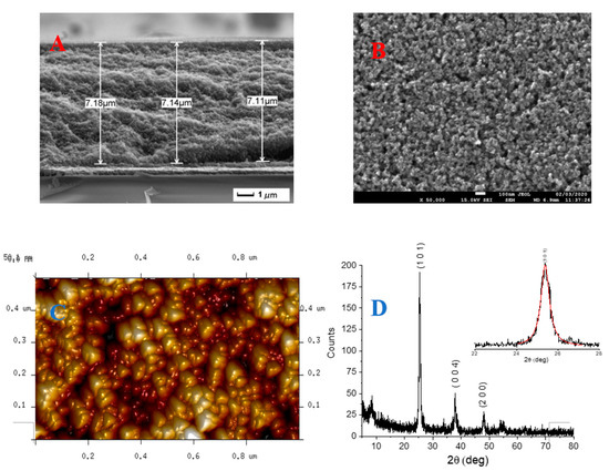 Atomic force microscopy (AFM) images were collected using a Digital Instruments Nanoscope III scanning probe microscope (Veeco-Digital Instruments, Plainview, NY, USA). The instrument was equipped with a silicon tip (RTESP-300 Bruker, Billerica, MA, USA) and operated in tapping mode. Surface topographical analysis of AFM images was carried out with a NanoScope Analysis 1.5. Scanning electron microscopy of the films was obtained with a JEOL JSM-7001F FEG-SEM (JEOL Ltd., Tokyo, Japan) scanning electron microscope (SEM) apparatus. Measurements were performed at 10.0–20.0 k eV electron beam energy, and the working distance was maintained between 3 and 10 mm. Surface morphology images were acquired in top-down and tilted modes, whereas cross-sectional analysis was performed putting the films on a 90° stub. X-ray diffraction (XRD) measurements were performed using a BRUKER D8 Advance X-ray diffractometer equipped with a Sol-X detector, working at 40 kV and 40 mA. The X-ray diffraction patterns were collected in a step-scanning mode with steps of Δ2θ = 0.02° and a counting time of 10 s/step using Cu Kα1 radiation (λ = 1.54056 Å) in the 2θ range of 3–80° using an incident grazing angle set-up. The crystal size (L) was estimated from the full width at half maximum (FWHM) of the intense (101) peak after correction from the instrumental broadening, by using the Scherrer Equation as follows: