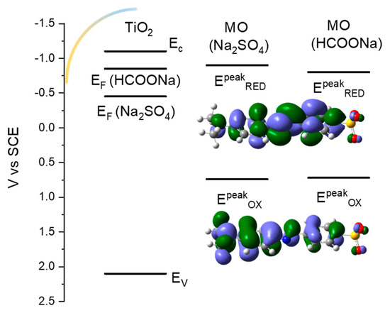 Energy levels (represented on the electrochemical scale vs. SCE) involved in the reductive degradation of the methyl orange (MO) dye at TiO2 photoelectrodes. The exponential Density of States (DOS) of the TiO2 is represented by the yellow-to-cyan curve starting at ca. −0.55 V vs. SCE, consistent with the CV results reported in the Supporting Information. In the presence of formate, the electrochemical potential of TiO2 matches well the first reduction peak potential of MO in the same solvent.