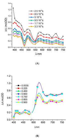 Transient spectra of TiO2 thin films in contact with aqueous solutions under aerated conditions. Laser excitation wavelength 355 nm, 5 mJ/cm2/pulse. (A) Pure water: difference spectra were sampled at delays from 0.25 ms to 0.33 s. (B) Aqueous solution of formate (0.1 M): difference spectra were sampled at delays from 3.5 ms to 0.9 s.