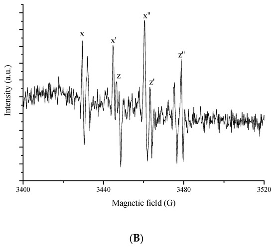 Photoexcitation of deaerated suspensions of TiO2 powder in water containing the spin trap DMPO caused the formation of a quartet, 1:2:2:1 (aN = aH = 14.5 G), ascribable to the paramagnetic adduct [DMPO-OH]• in accordance with previous investigation [41,42] (Figure 4A). Hydroxyl radicals, formed by the reaction between water on the TiO2 surface and positive holes, were then trapped by DMPO, according to reactions (R1) and (R2):