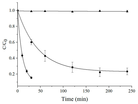 An analogous behavior was observed when AO7 was used instead of MO. C/C0 vs. time reported in Figure 6 (full circles) showed that around 90% of this dye disappeared from the solution after only 30 min irradiation.