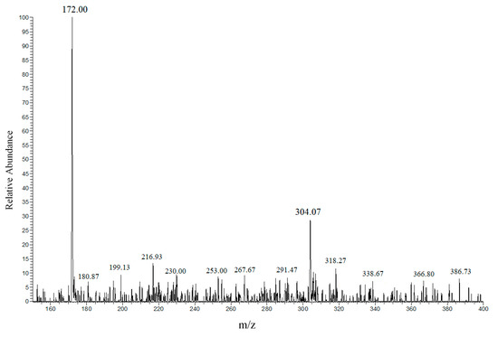 With the aim of ascertaining that the observed decrease of dye concentration is due to the reductive cleavage of the azo bond with formation of the two amine derivatives, we recorded the negative ion mode ESI–MS spectrum of the irradiated solution (Figure 7). Besides the m/z peak at 304 relative to the residual MO in its anionic form, the dominant base peak at m/z 172 corresponded to the anionic form of sulfanilic acid [47]. A similar result was obtained in the case of AO7 (Figure S9). Conversely, no evidence of the m/z 172 peak was obtained in the ESI–MS spectrum recorded after photocatalytic processing of the dye in the absence of formate (Figure S10). Detection of a peak with m/z 227 was in agreement with the formation of a byproduct whose molecular weight was consistent with hydroxyl group substitution on a phenyl ring [18]. In addition, many examples in the literature report that oxidation of aromatic organic molecules (such as drugs, pesticides) proceeds by the addition of hydroxyl radicals before ring breaking [15,21,48,49]. Thus, the pattern reported in Figure S4 is characteristic of a degradative process promoted by OH radicals.