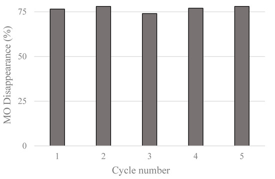 MO disappearance (%) obtained by irradiating (4 h, λ ≥ 360 nm) the same FTO supported TiO2 thin film during five consecutive photocatalytic runs.