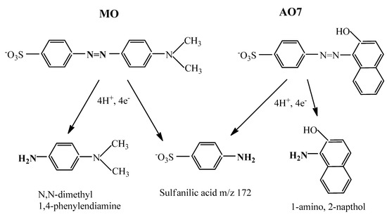 Representation of N=N reductive cleavage of MO and of AO7 with formation of amine intermediates and of sulfanilic acid.