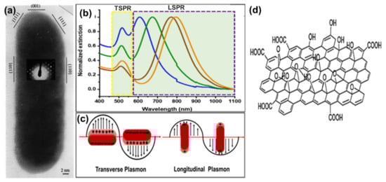 (a) High-resolution TEM image of gold nanorods (AuNRs) oriented along the (110) direction, showing the faceted crystal structure of the rod; the inset is the electron diffraction pattern recorded from the rod, which proves the single crystalline structure of the rod. Adapted from ref [18], with permission from Elsevier, 1999. (b) UV−Vis−NIR spectra of AuNRs with different transverse surface plasmon resonance (TSPR) and TSPR wavelength position. Adapted from ref [19], with permission from American Chemical Society, 2018. (c) Diagram illustrating the conduction band electron oscillation upon transverse (left) and longitudinal (right) localized surface plasmon resonances of AuNRs. (d) Typical structure of graphene oxide Adapted from [20] with permission from RSC advances, 2011.