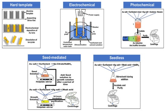 Since the discovery of AuNRs, several methods have been developed to solve the challenges in the synthesis, which includes high product yield, robustness to minor impurities, precise control over AuNRs surface chemistry, stability, and most importantly, a feasible method to suit specific applications [16]. Different methods such as the template method [46,47,48], electrochemical method, photochemical method [49,50], and seed-mediated method [4,13,51,52,53] have been reported for the synthesis of AuNRs [9] (Figure 2). A combination of some of these methods can also be carried out for advanced synthesis. Factors such as temperature [15,54], pH [19,53,55,56,57], type of surfactant [13,14,17,52,53,57,58,59,60,61], reagents concentration [10,16,50,62,63,64,65,66], additives [67,68,69], and the seed quality [4,51,52,53,70,71] influence the growth and purity of AuNRs.