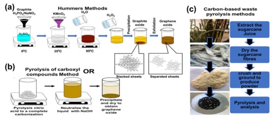 Schematics illustration for different synthesis of graphene oxide (GO): (a) Hummers method (b) pyrolysis of carboxyl compounds method and (c) pyrolysis of carbon-based waste.