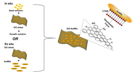 The general two ways of coating AuNRs with GO are usually referred to as in situ and ex situ methods (Figure 4). In situ is the direct growth of AuNRs on the surface of GO, whereas in the ex situ method, both AuNRs and GO are prepared separately and later combined together. The ex situ method can be achieved by a direct electrostatic reaction between GO and AuNRs.