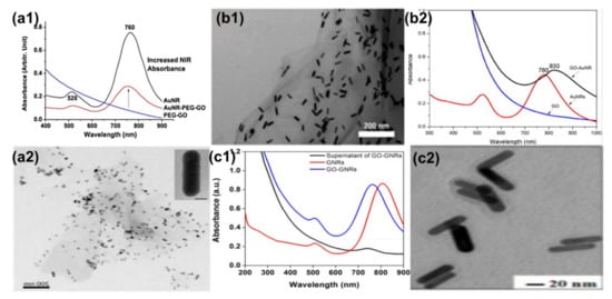 (a1) UV-Vis spectrum of the polyethylene glycol (PEG)–GO molecules, AuNRs, and their assembled composites of AuNRs–PEG–GO, (a2) TEM images of the AuNRs–PEG–GO composites. An enlargement of the AuNRs–PEG–GO composites is shown for a better demonstration of the assembly (scale bars: 200 nm). The inset figure with the 5 nm scale bar indicates an attached single gold nanorod. Adapted from [29], with permission from Wiley, 2013. (b1) TEM image (scale bar: 200 nm) and (b2) UV-Vis spectrum of GO–AuNRs Adapted from ref [115], with permission from Elsevier, 2013. (c1) UV-Vis spectrum of GO–AuNRs and AuNRs. (c2) TEM images of GO–AuNRs (scale bar: 20 nm). Adapted from [118], with permission from RSC advances, 2011.