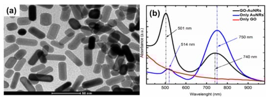 (a) TEM images of the GO–AuNRs (scale bars: 50 nm). (b) UV-Vis spectrum of the comparison of GO–AuNRs, AuNRs, and GO. Adapted from [119], with permission from RSC advances, 2011.