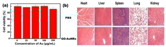 Lim et al. [31] reported the synthesis of plasmonic gold nanoshells (AuNSs) and AuNRs coated with rGO and evaluated their cytotoxicity against human umbilical vein endothelial cells (HUVECs). HUVECs exposed to GO-coated particles for 24 h at an optical density of 1.0 had no significant cytotoxicity [31]. Another study by Sun et al. [38] reported the cell viability of the human pancreatic adenocarcinoma cell line (SW1990 cancer cells) against GO–PSS–AuNRs (Figure 8a). Different concentrations of GO–PSS–AuNRs nanohybrids (0–200 μg/mL) exposed to the cells for 24 h were measured by a Cell Counting Kit-8 (CCK-8) assay, and all concentration tested showed no significant toxicity, even at high concentration (200 µg/mL). The in vivo long-term toxicity assessment of the GO–AuNRs after a month of exposure did not show obvious inflammation, cell necrosis, or apoptosis to normal organs (Figure 8b) [38].