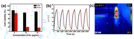 (a) Phototoxicity assay of SW1990 cells in the presence of different amounts of GO–PSS–AuNRs with or without laser irradiation (808 nm) for 10 min. (b) Photothermal profiling of on and off cycle of GO–AuNRs (50 µg/mL) for 4000 s. Adapted from [38], with permission from Springer Nature, 2016. (c) IR image of GO–AuNRs irradiated with laser. Adapted from [30] with permission from Elsevier, 2017.