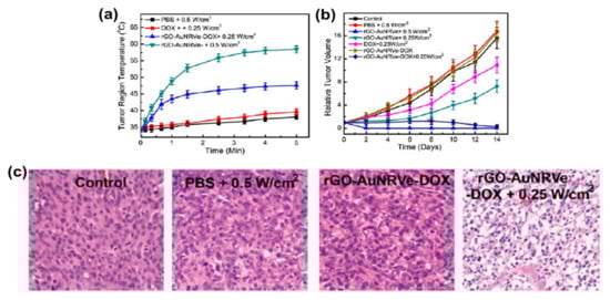 The combination of therapy and diagnosis that is also known as theranostic is becoming one of the most interesting studies in cancer research [131] due to its great potential in personalized cancer medicine. The theranostic agent must have a characteristic such as the ability to diagnose a disease, its status, and its response to a specific treatment while at the same time perform treatment [132]. The coating of AuNRs with GO has produced a material that is biocompatible and useful in biomedical application. However, studies of GO-coated AuNRs as a theranostic agent are still rare in cancer therapy. The most common studies of GO–AuNRs are based on conjugation with a cancer drug. Song et al. [34] fabricated an rGO–AuNRs vesicle (Ve) with remarkably amplified photoacoustic (PA) performance and photothermal effects when loaded with doxorubicin (DOX). Both the cavity of the vesicle and the large surface area of the encapsulated rGO can be used for loading DOX, making it an excellent drug carrier. The combination of chemo- and photothermal therapies revealed an effective inhibition of tumors. The in vivo studies of rGO–AuNRsVe–DOX generated more heat even at low power density than bare rGO–AuNRsVe (Figure 10a). The tumor-bearing mice were intravenously injected with PBS, DOX, and rGO–AuNRsVe–DOX and exposed to the 808 nm laser at different power densities (Figure 10b). The relative tumor volume was reduced when treated with rGO–AuNRsVe–DOX irradiated at lower power density compared with bare rGO–AuNRsVe irradiated at higher power density. The tumor tissue section under treatment with rGO–AuNRsVe–DOX irradiated with laser showed more severe cancer necrosis and fewer cancer cells (Figure 10c). On the contrary, mice treated with PBS, laser irradiation, or rGO–AuNRsVe–DOX without laser irradiation did not exhibit any tumor necrosis [34].