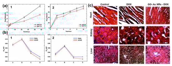 (a) Percentage of drug release with respect to time (1) without near-infrared (NIR) and (2) with NIR irradiation. (b) IC50 values on in vitro cell lines (1) without NIR irradiation and (2) with NIR irradiation. (c) Histological images of a heart, kidney, and liver treated by DOX and fGO–AuNR–DOX Adapted from [30], with permission from Elsevier, 2017.